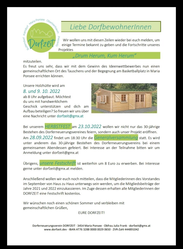 Was die nächsten Wochen so langes ansteht findest du hier! Wir freuen uns darauf unsere Ideen umzusetzen und euch dich – bei der Generalversammlung, beim Aufstellen unserer Drum herum-Hütte, beim Herbstfest, beim Spazieren gehen.